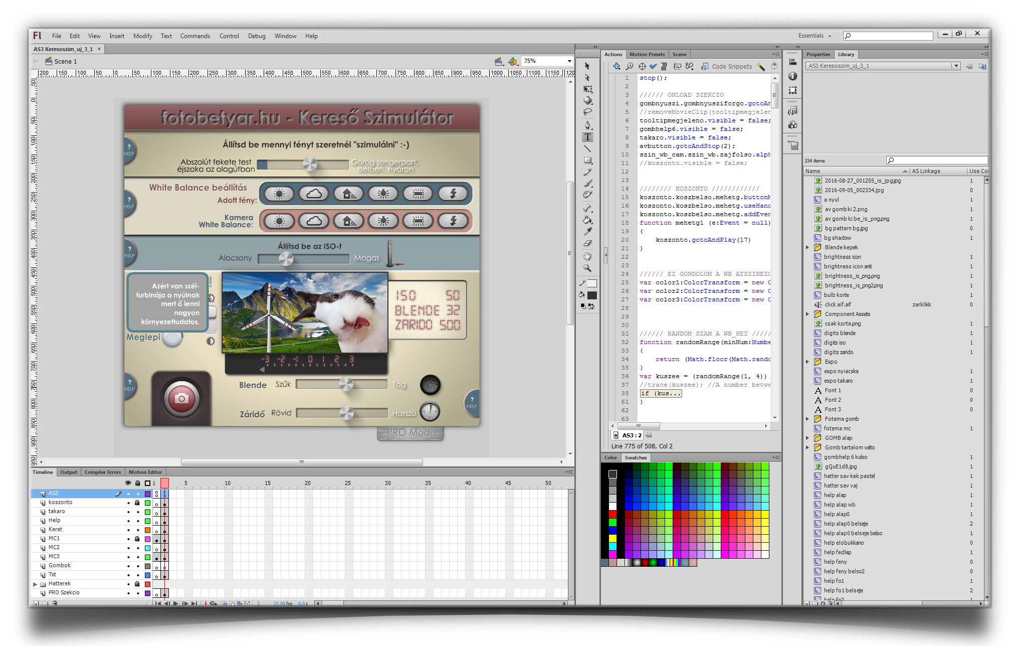 Feltételezzük nyájas olvasó még tán nem készítettél ilyen anyagokat, a következő képen képzeld el a különbséget >> a Flash fejlesztői program egy vizuális környezettel rendelkező, rétegekkel, rajz eszközökkel, a programozási részt leszámítva nagyon könnyen kezelhető kis program. Ime egy kép a Flashről, kereső szimulátorunk megújítása közben: